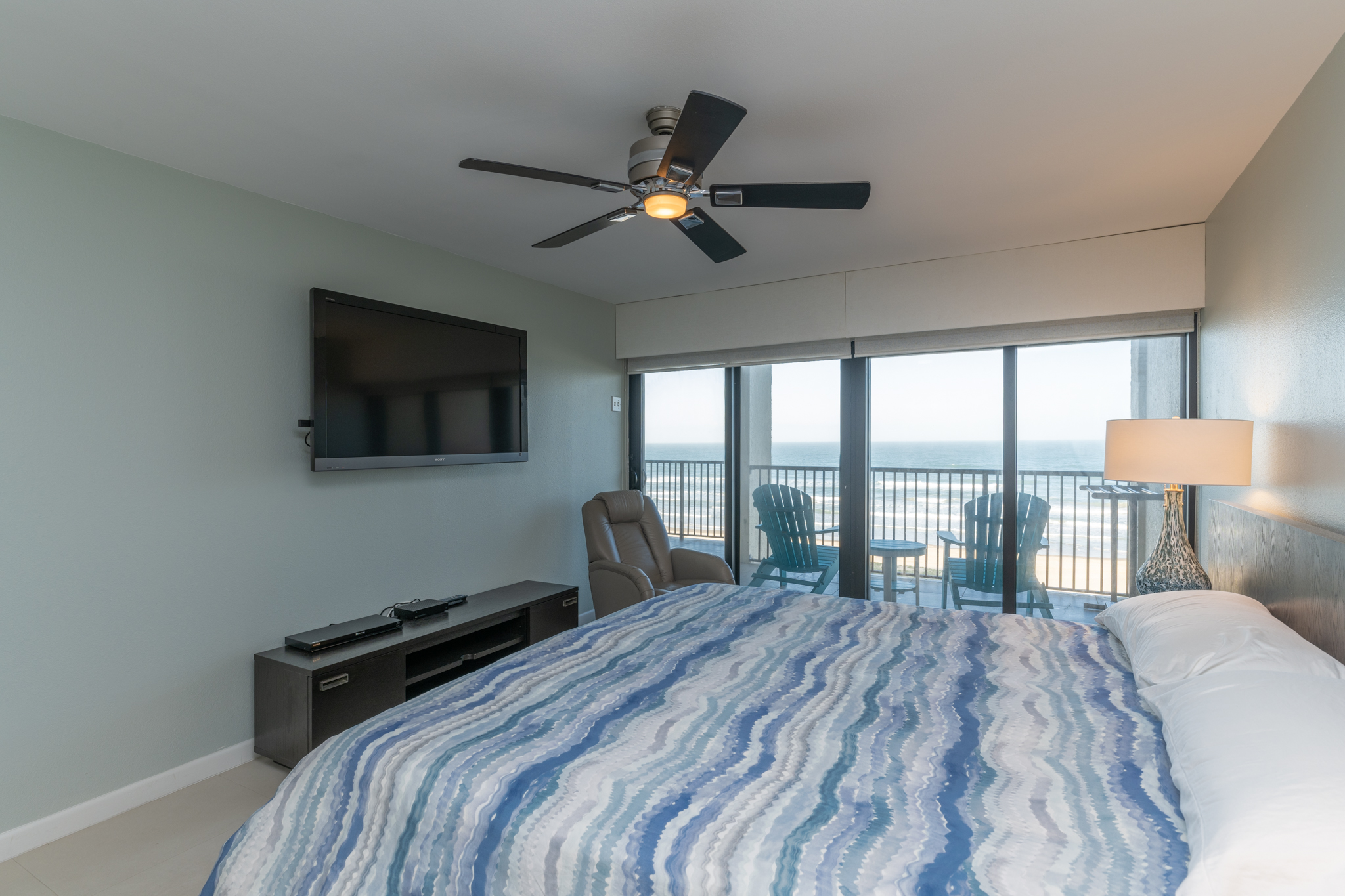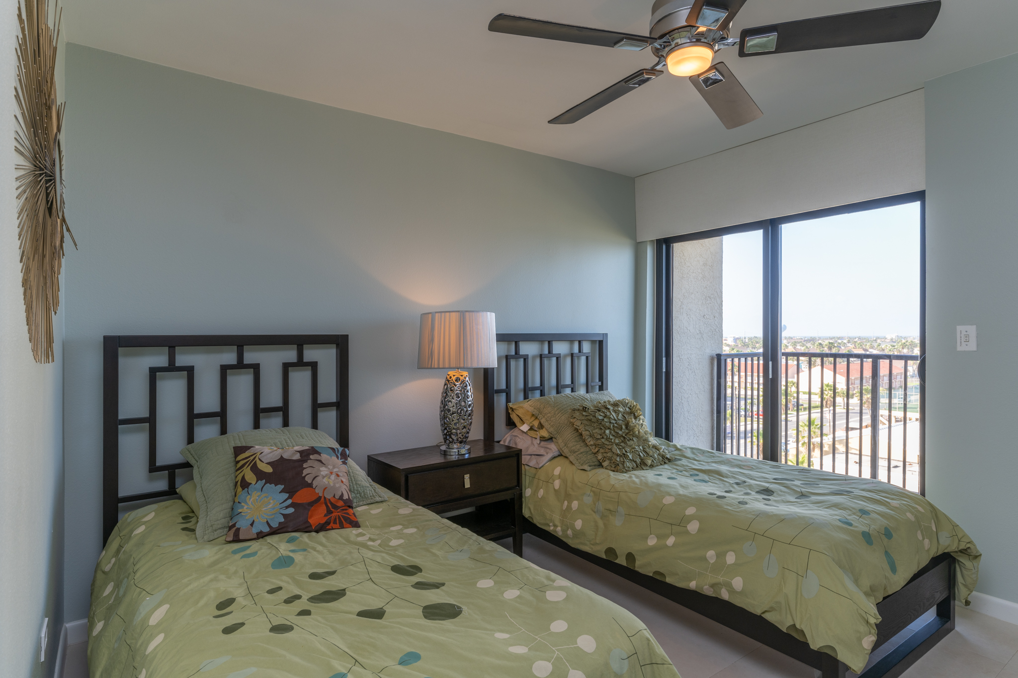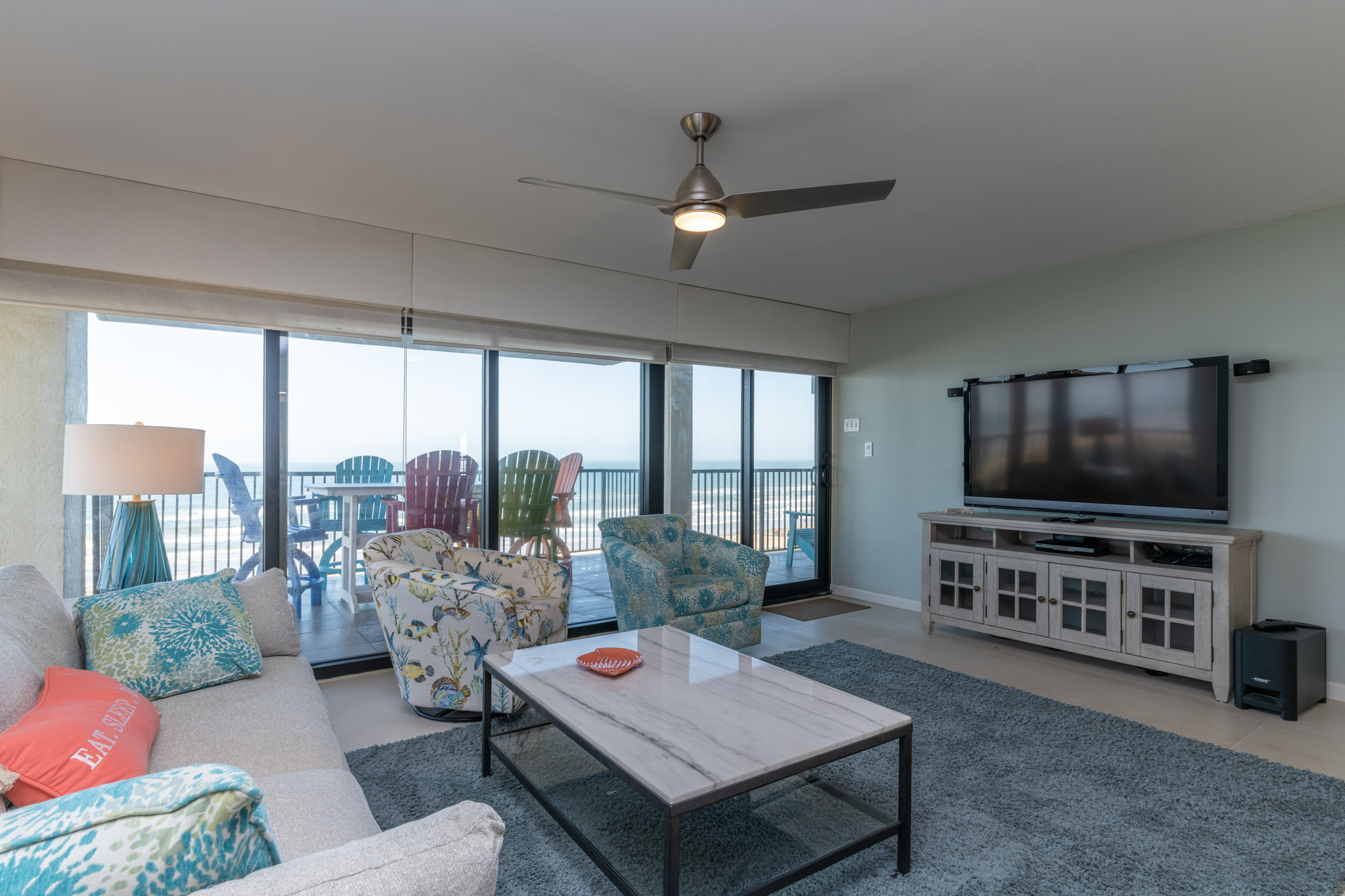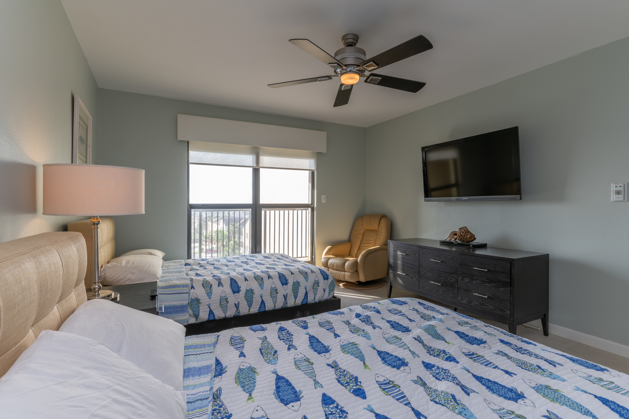 The master bedroom has a king-sized bed, private bathroom with walk in shower, and views of the beach. The 2nd bedroom is furnished with two full-sized beds and has an adjoining bathroom with a walk in shower. The 3rd bedroom has two twin size beds and it’s own balcony overlooking the island and view of the bay. Each bedroom has a wall mounted flat screen television with an Amazon Fire Stick for you to stream your favorite subscriptions . Our condo comfortably sleeps 8 people.