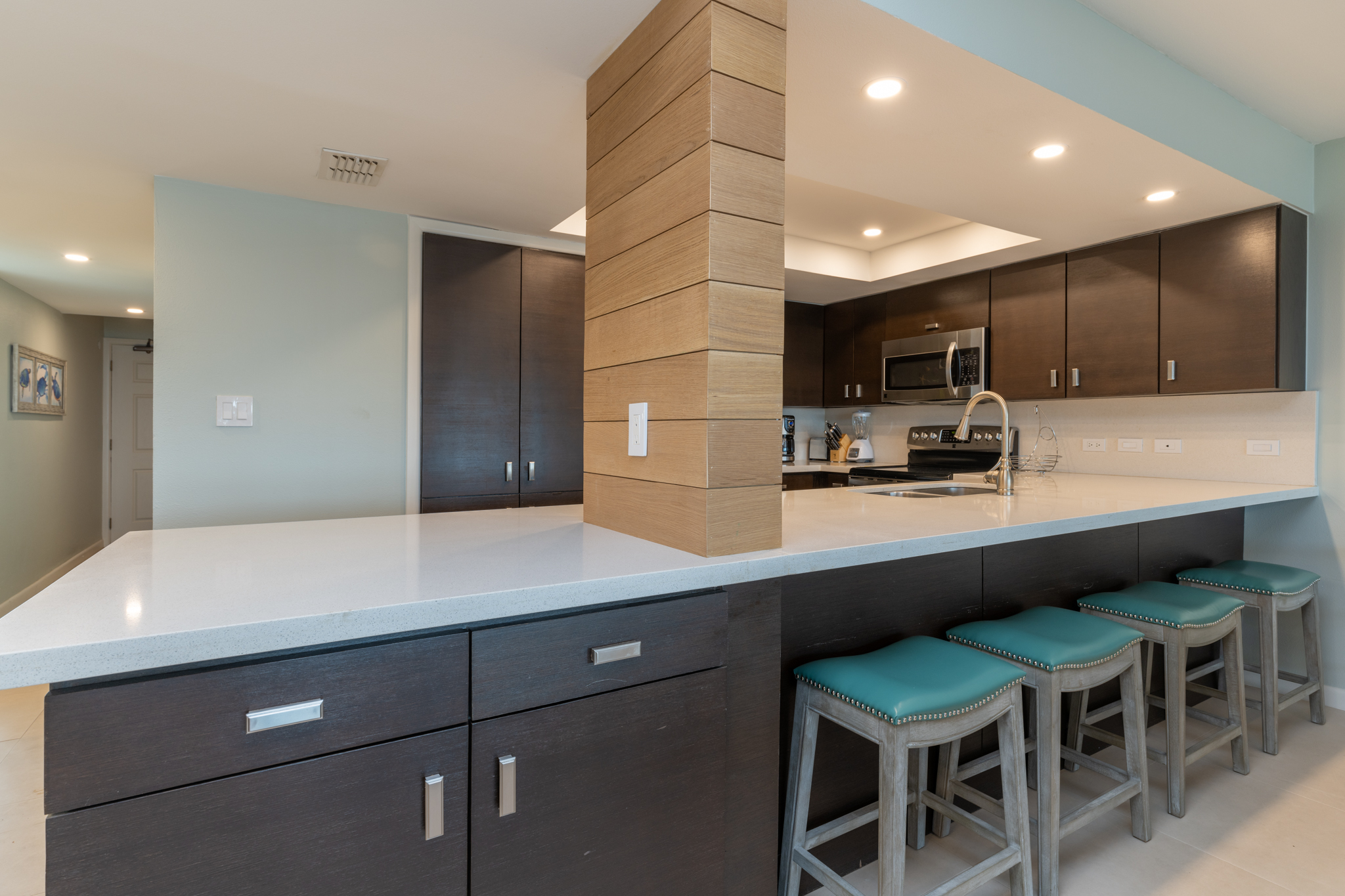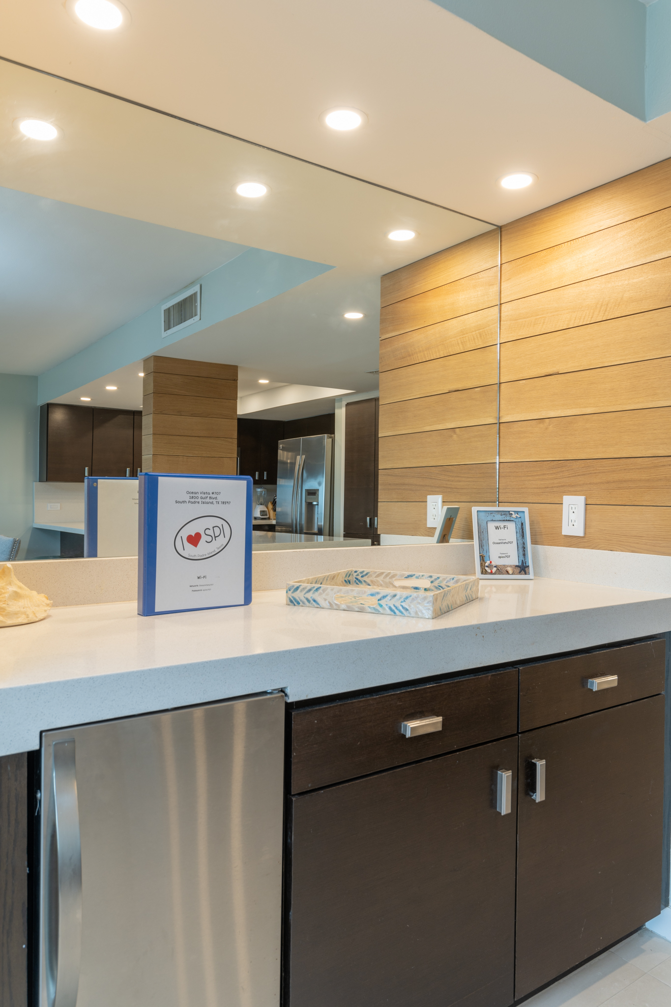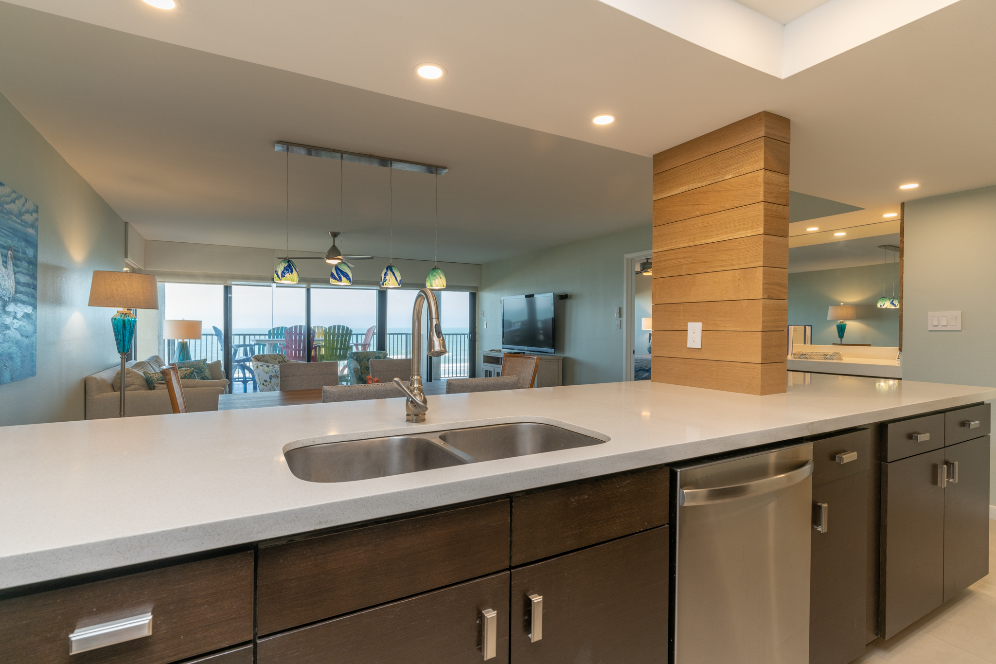 The open living area has all new furnishings and a large flat screen TV with Amazon Fire Stick. Enjoy the beautiful view of the ocean through the wall of windows! You will find everything you need in our fully equipped kitchen. There is also an additional bar area with a small beverage refrigerator, and we have a full sized washer/dryer in the laundry room.