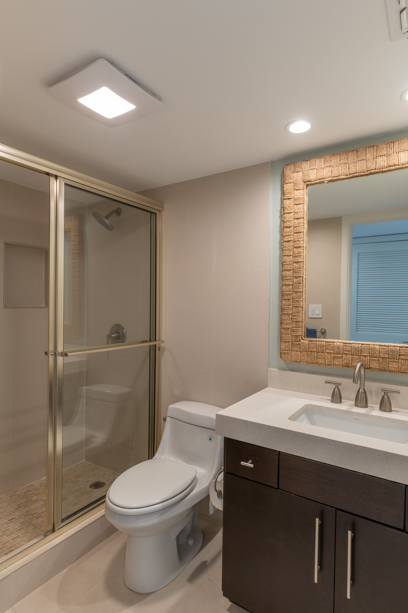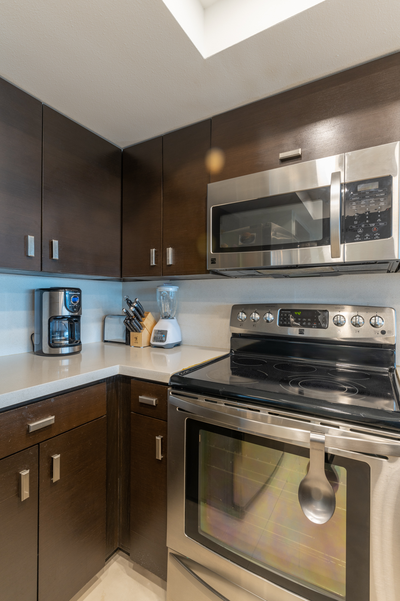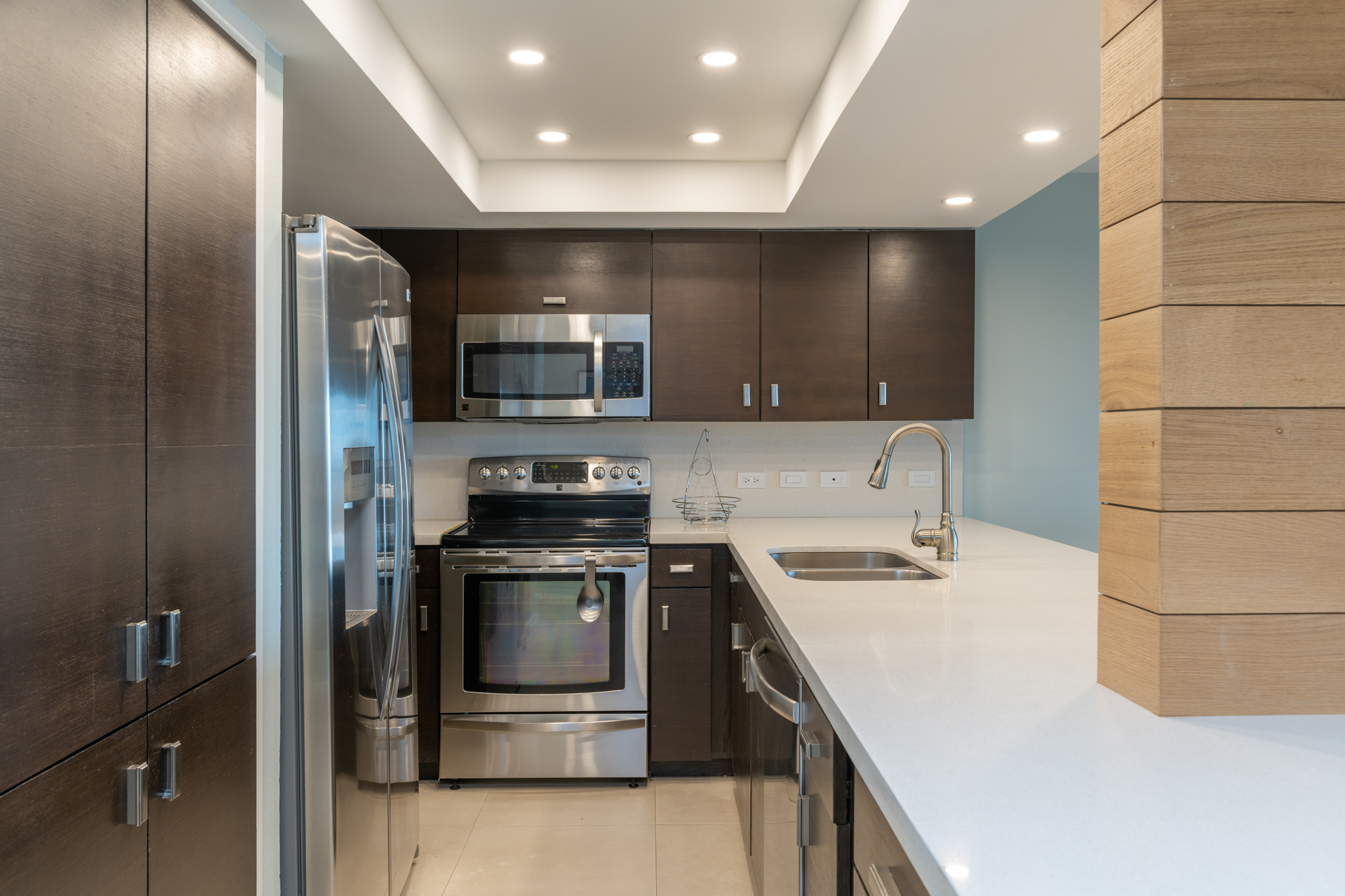 The open living area has all new furnishings and a large flat screen TV with Amazon Fire Stick. Enjoy the beautiful view of the ocean through the wall of windows! You will find everything you need in our fully equipped kitchen. There is also an additional bar area with a small beverage refrigerator, and we have a full sized washer/dryer in the laundry room.